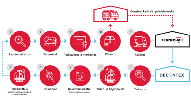 1: Palolaitos toimittaa varusteet Teknosafelle sovitun aikataulun mukaisesti, ja me lähetämme ne edelleen Decontex-puhdistukseen.